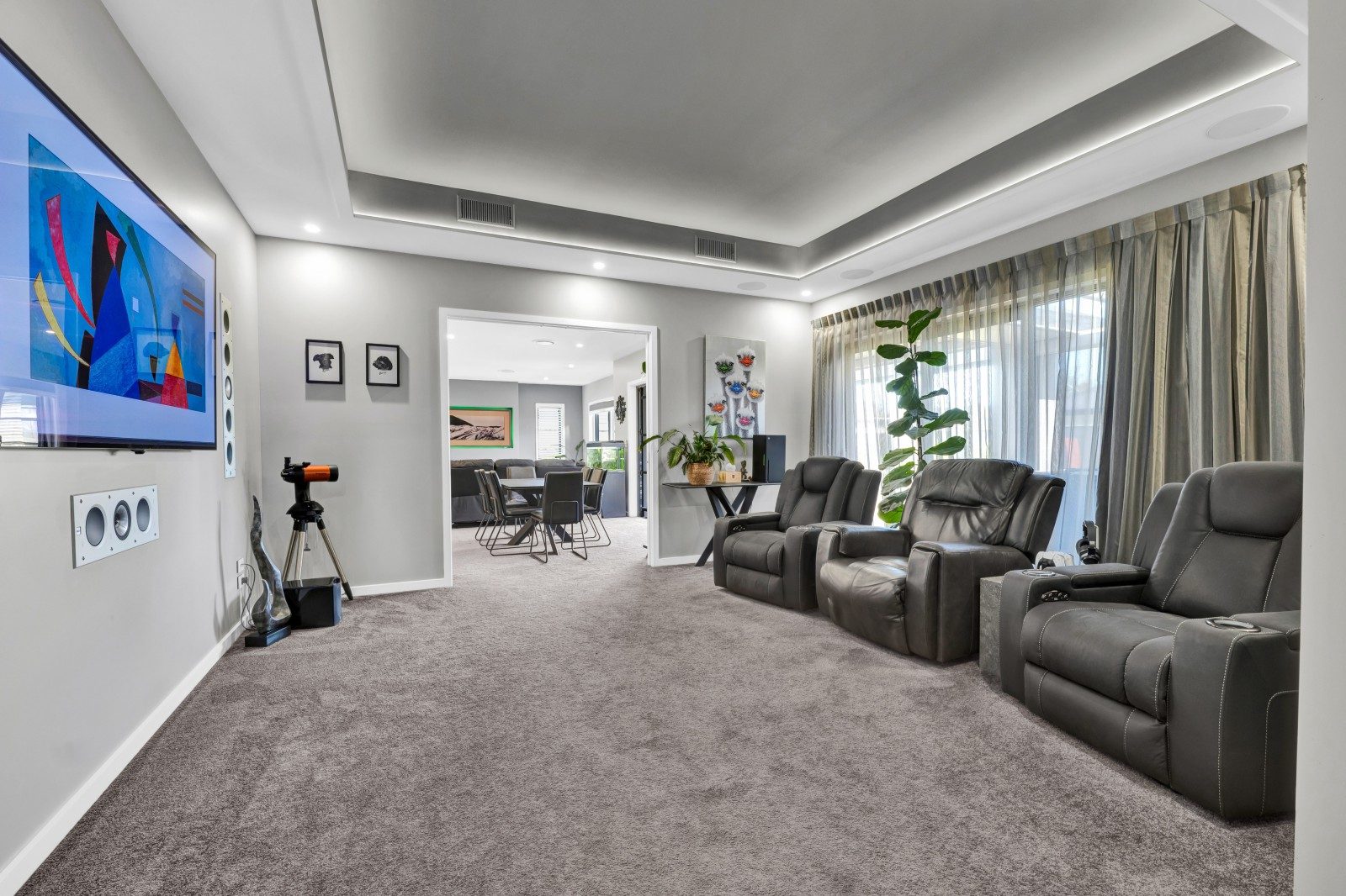 The heart of the home is the open-plan lounge, dining, and sleek kitchen with walk-in pantry – a space that flows effortlessly for weekday breakfasts, weekend gatherings, or entertaining friends and the four generous bedrooms give everyone room to spread out. The private master suite offers a luxurious tiled ensuite plus a spacious and well-fitted walk-in wardrobe. Soaring 2.7m stud ceilings create a bright and open atmosphere throughout the home, and the large open-plan living provides plenty of space for quiet evenings in or entertaining outside. The dedicated media room with built-in speakers and voice-activated lighting ensures movie nights feel truly cinematic and a control room keeps everything running seamlessly.